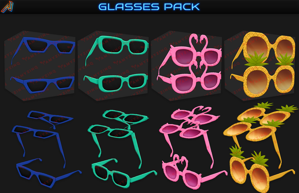 TAGS: Glasses, Sunglasses, Tropical, Sun, Palm, Shades, Spectacles, 3D, Blinds, Chanel, Pineapple, Flamingo, Heart, Flower, Flowers, Hearts, Flamingos, Pineapples, Beach, Sunny, Sun, Pool, Accessories, Headwear, Head, Face, CIT, Texturepack, Resourcepack, 3D Model,